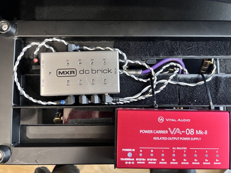 このペダルトレインのボードの裏には少し空間があって、そこにパワーサプライ(電源供給機器)を忍ばせたりするんですが…