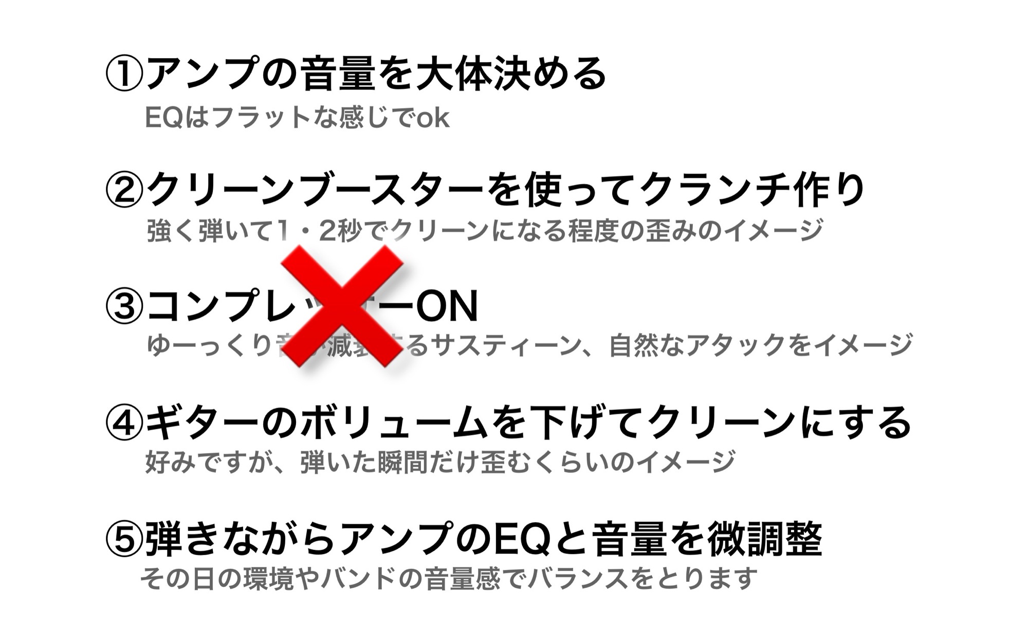 歪みエフェクターとコンプレッサーを使ってクランチを作り、ギターのボリュームを絞ってクリーンの音を作る
